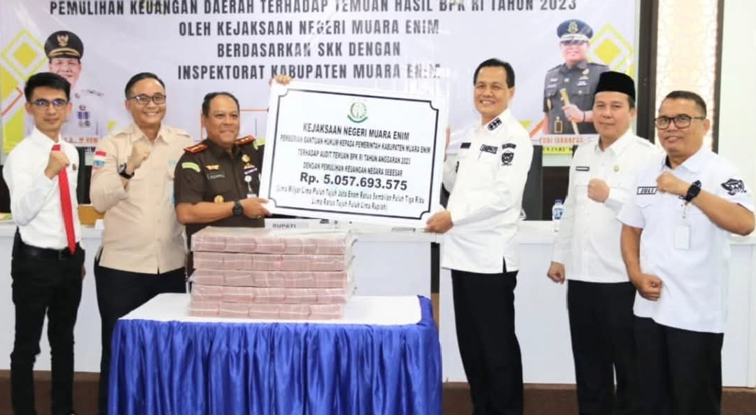 Muara Enim, SMC – Bupati Muara Enim, H. Edison, S.H., M.Hum., mengapresiasi kinerja Kejaksaan Negeri (Kejari) Muara Enim @kejari.muaraenim yang berhasil memulihkan keuangan negara mencapai Rp5,05 miliar kepada Pemerintah Kabupaten Muara Enim. Hal ini disampaikan Bupati saat menerima penyerahan hasil pemulihan keuangan negara tahap pertama yang diserahkan langsung oleh Kepala Kejari Muara Enim, Rudi Iskandar, S.H., M.H., di Kantor Bank Sumsel Babel (BSB) Cabang Muara Enim @banksumselbabelmuaraenim Rabu (07/05).
